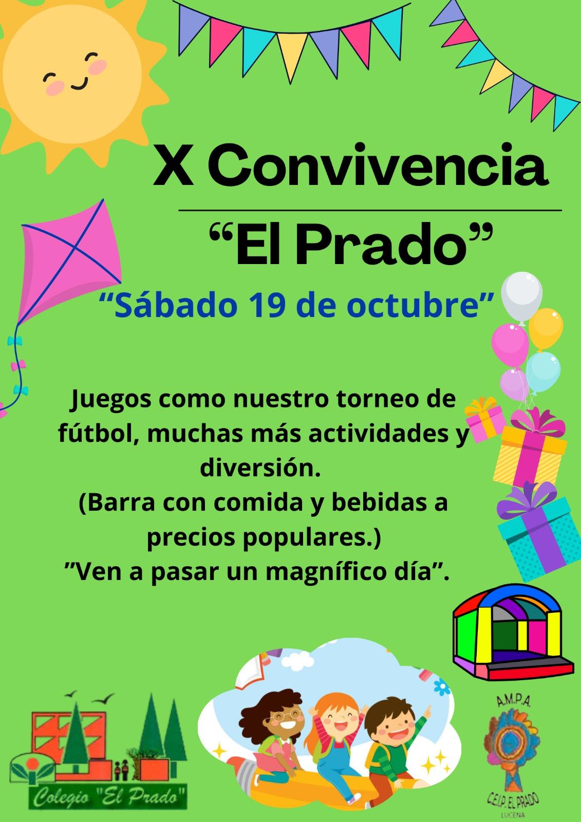 19-10-24 ¡Hemos celebrado nuestra X Convivencia en El Prado! Hoy sábado se ha celebrado la Convivencia de nuestra Comunidad Educativa desde media mañana hasta la noche. Fue un día cargado de buena gastronomía, actividades deportivas, lúdicas, hinchables para los peques, sorteos, pintacaras, manualidades, un buen ambiente y todo muy bien organizado por nuestra AMPA y … Sigue leyendo ¡Celebramos nuestra X Convivencia «El Prado»!