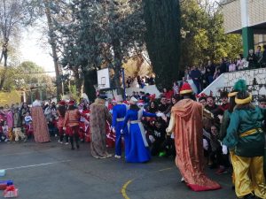 Nuestros Reyes Magos y un singular personaje: Papá Noel hacían una parada en El Prado y recibían a todo el alumnado y profesorado del colegio con entusiasmo, recogiendo una por una, las cartas dirigidas a Oriente.