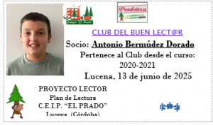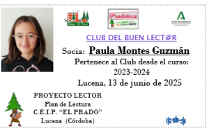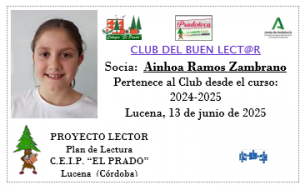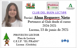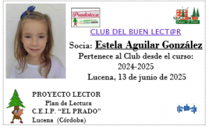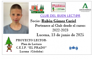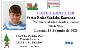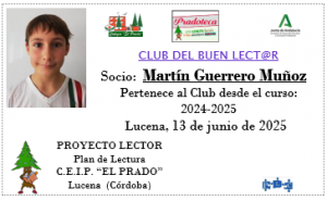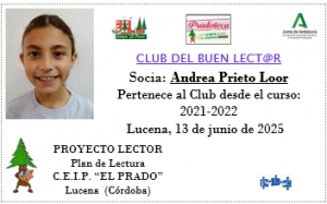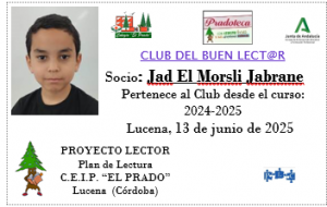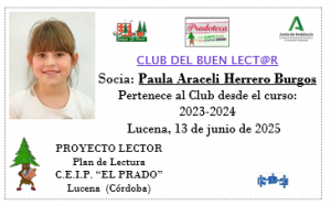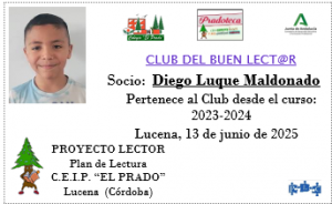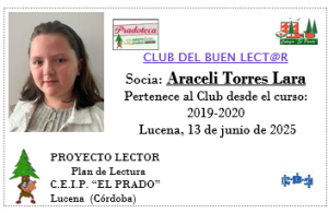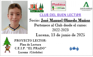 Dentro del Proyecto Lector que se realiza durante todo el curso se desarrolla el Plan de Lectura de la Biblioteca y el Club del Buen Lect@r. Uno de los Objetivos concretos para el curso es : «Reconocer el trabajo y el esfuerzo en aquellas actividades que se organicen con sus diplomas, carnets, fotos en la web: Club del Buen Lector/a, concurso lector, equipo del alumnado ayudante de la biblioteca, préstamo al lector, etc.»