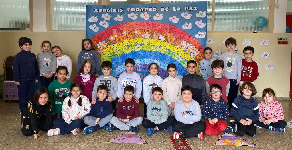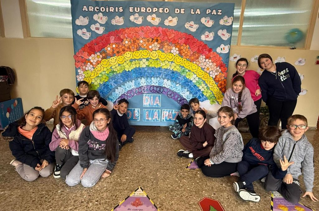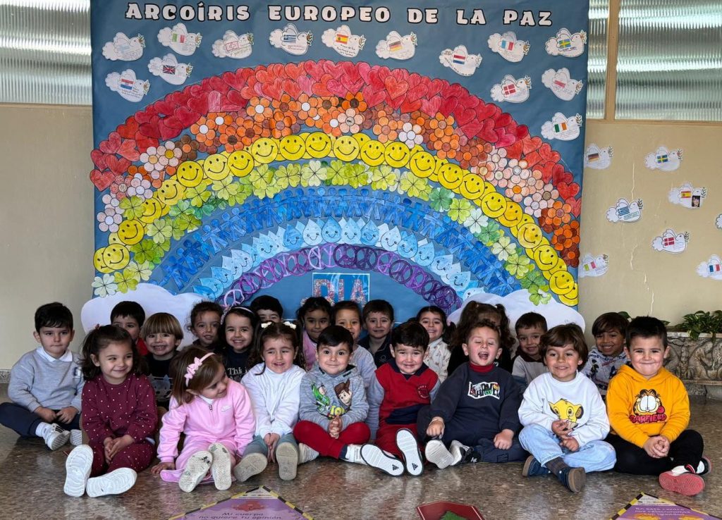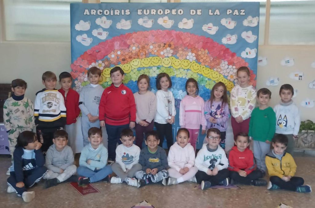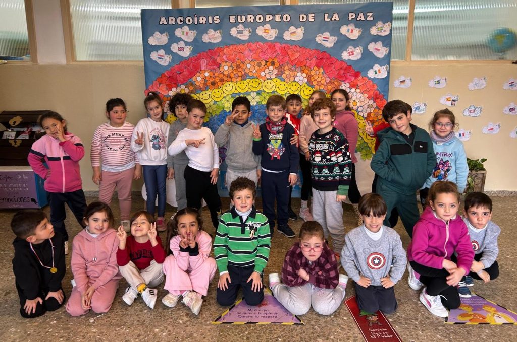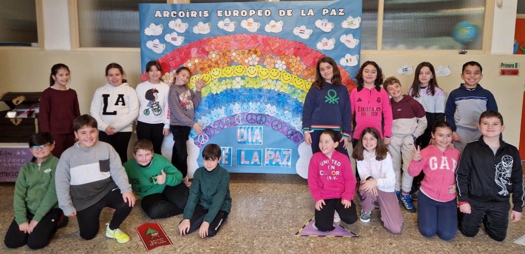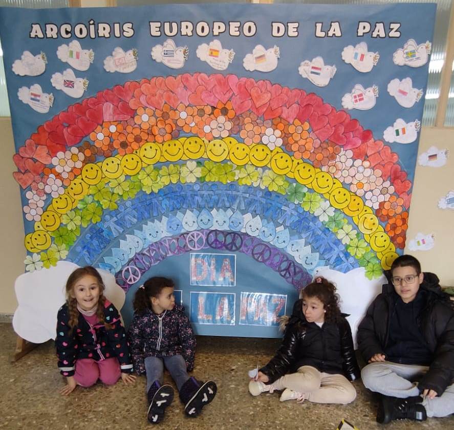 Este mural lo ha formado dibujos relacionados con la paz y 2 palomas por cada clase, que se han coloreado con la bandera del país que cada nivel tiene asignado desde el primer trimestre con motivo del Proyecto Integrado del centro: «ExpoEuropa El Prado» y se ha investigado sobre dos personas del país que sean o hayan sido relevantes por haber contribuido a la paz en el mundo. En la paloma, además de la bandera del país se ha escrito el nombre de las personas investigadas y alguna palabra, frase o lema relacionado con ellas. Con estas palomas hemos formado el Arcoíris con los dibujos elegidos por nivel y bajo él, hemos formado la palabra “PAZ”.