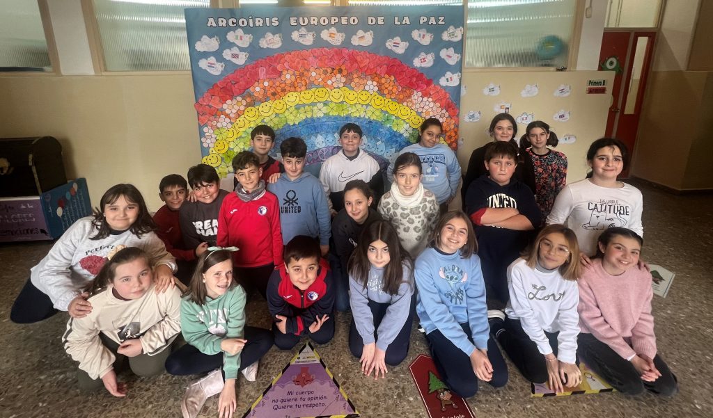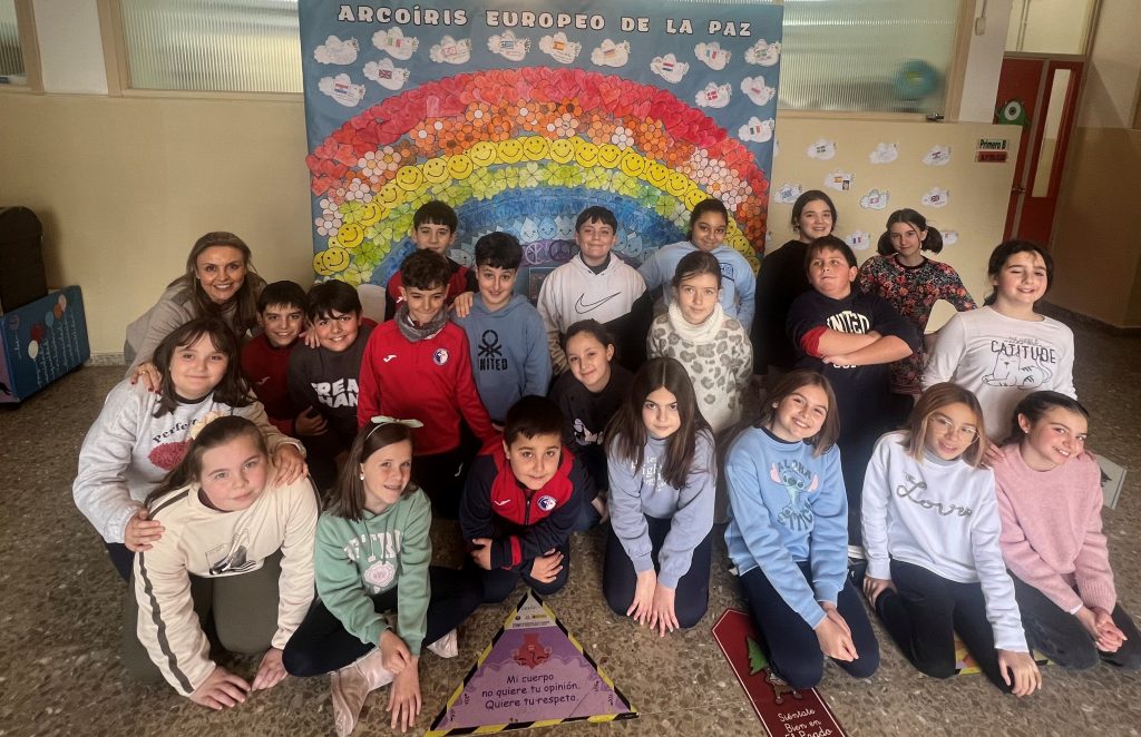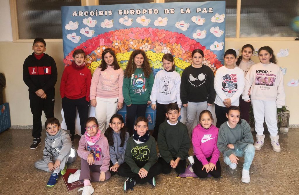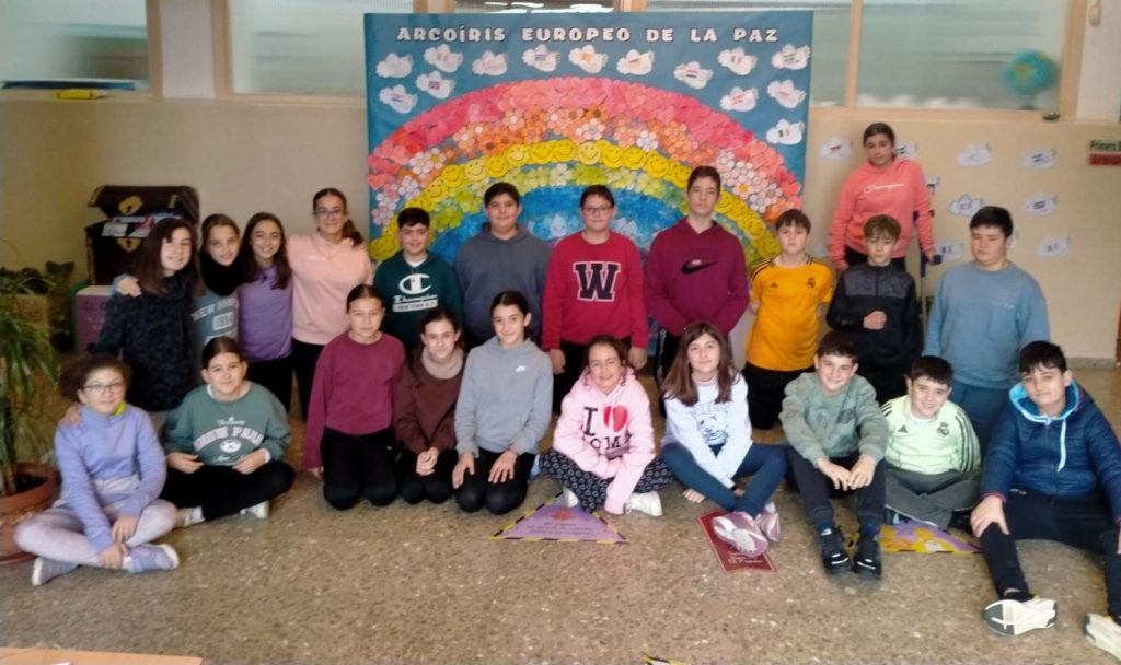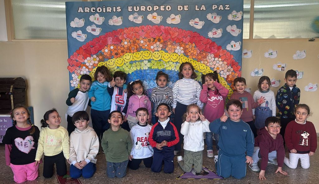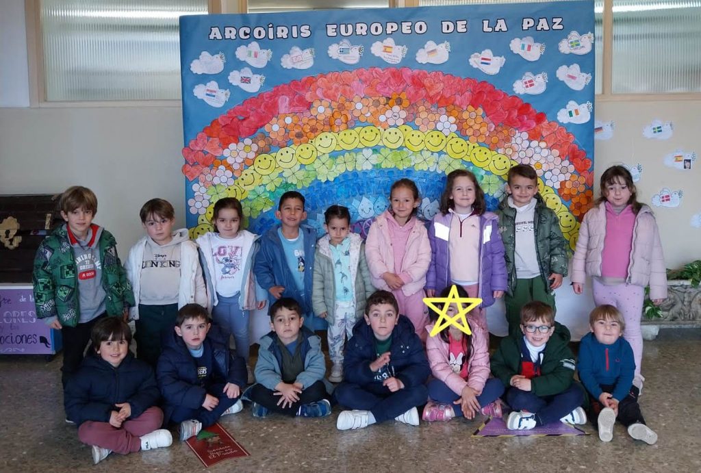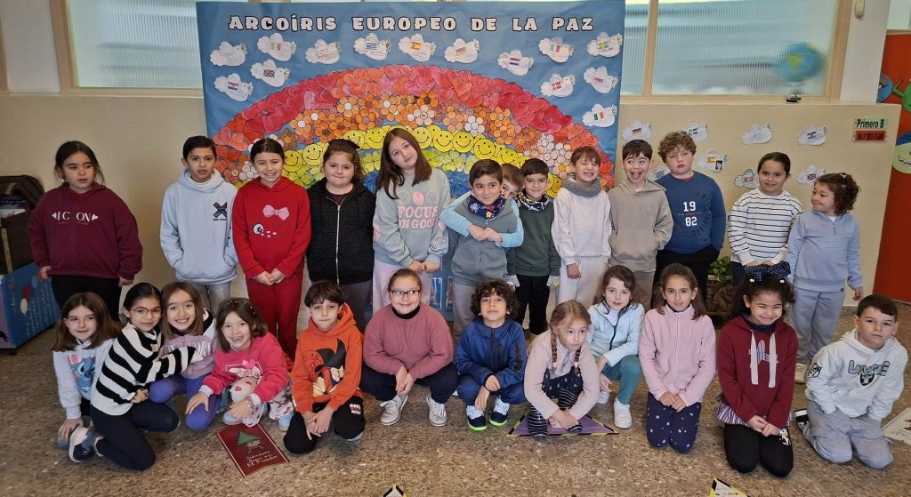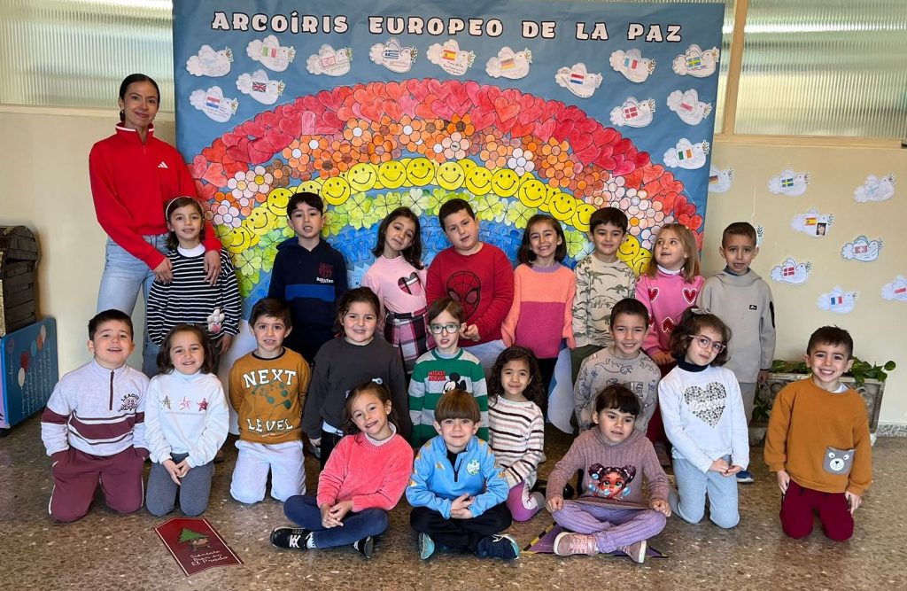 Este mural lo ha formado dibujos relacionados con la paz y 2 palomas por cada clase, que se han coloreado con la bandera del país que cada nivel tiene asignado desde el primer trimestre con motivo del Proyecto Integrado del centro: «ExpoEuropa El Prado» y se ha investigado sobre dos personas del país que sean o hayan sido relevantes por haber contribuido a la paz en el mundo. En la paloma, además de la bandera del país se ha escrito el nombre de las personas investigadas y alguna palabra, frase o lema relacionado con ellas. Con estas palomas hemos formado el Arcoíris con los dibujos elegidos por nivel y bajo él, hemos formado la palabra “PAZ”.