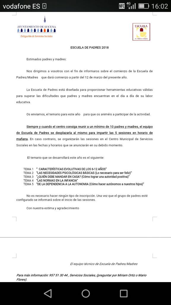 Ha comenzado la Escuela de Padres y Madres en nuestro Colegio. Es una actividad organizada por la Delegación de Servicios Sociales y Salud del Excmo. Ayuntamiento de Lucena, que durará cuatro jueves más a las 9,30 horas en el Salón de Actos.