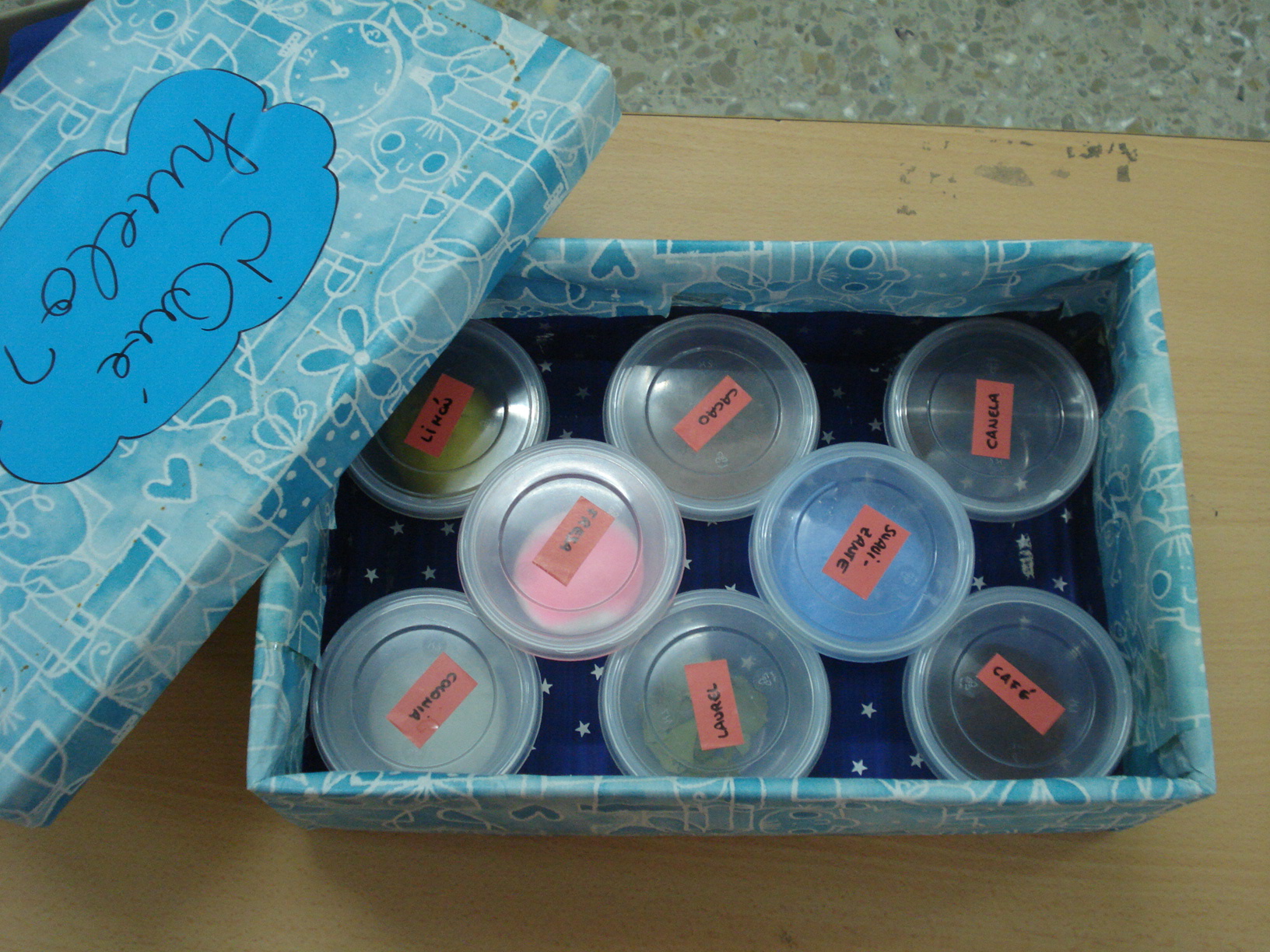 2) Adivinar qué había dentro de diversos tarritos a través del olfato: canela, café, fresa, colonia, suavizante, vainilla, limón, laurel…
