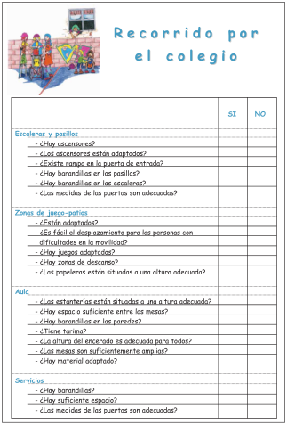 3) Reflexionar sobre las barreras arquitectónicas existentes en nuestro centro a través de un cuestionario extraído del material «Apreciamos las diferencias», de M.A. Verdugo Alonso, F. González Gil y M.I. Calvo Álvarez.