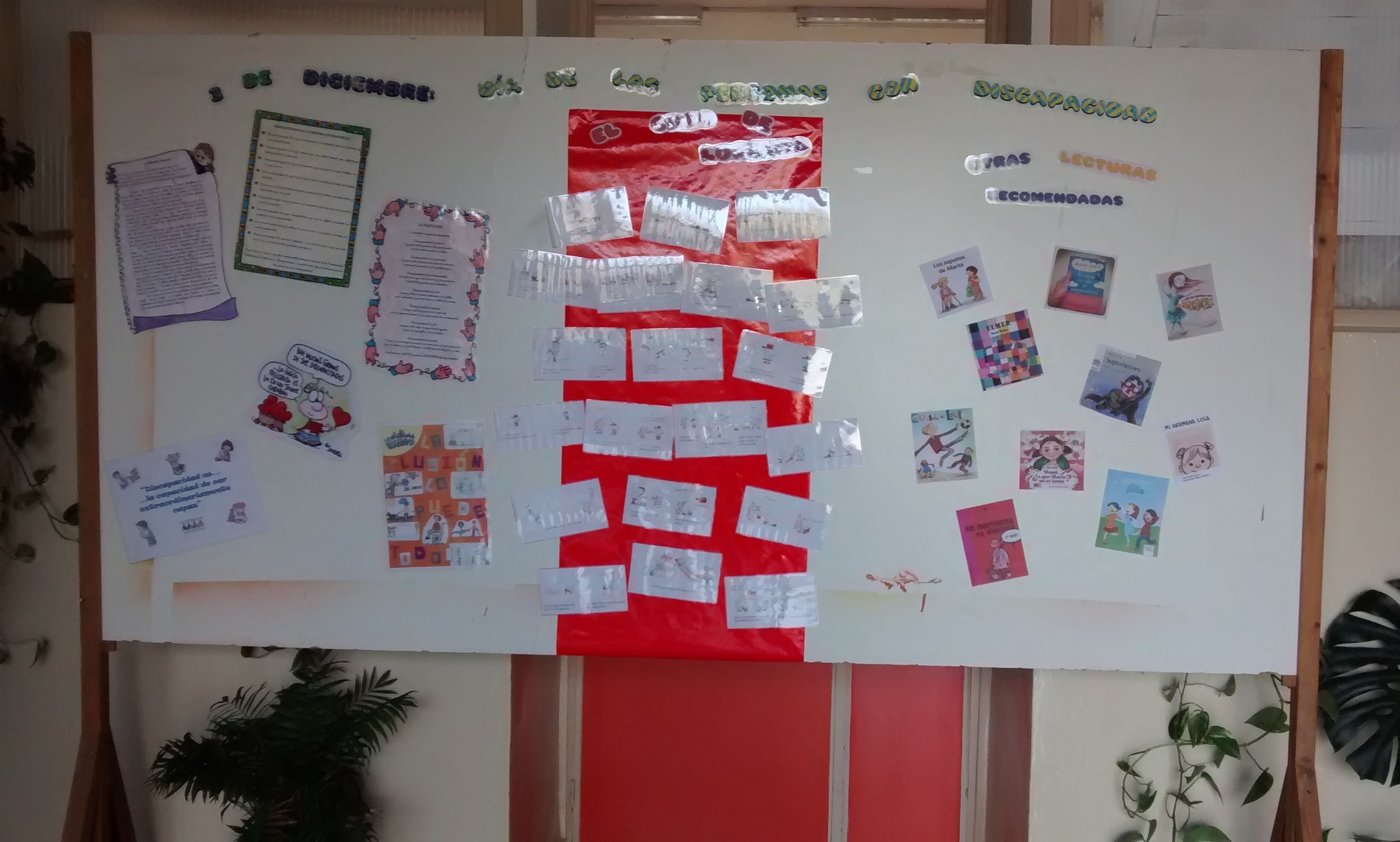 Por un lado, hemos colocado un mural en la entrada del centro en el que se han pinchado distintas lecturas y frases reflexivas sobre el tema, el texto del «Cazo de Lorenzo» en pictogramas y algunas lecturas recomendadas en las que los o las protagonistas son personas con alguna discapacidad.