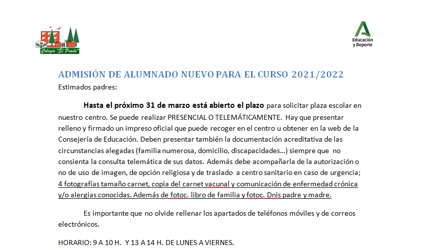- Calendario de actuaciones del procedimiento de escolarización para las enseñanzas de segundo ciclo de Educación Infantil, Primaria, Educación Especial, Secundaria y Bachillerato para el curso 2021/2 (Resolución de 15 de febrero de 2021. BOJA de 24 de febrero de 2021)