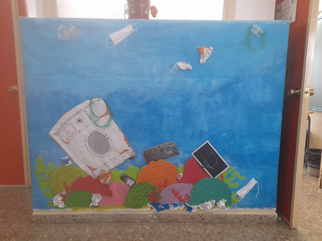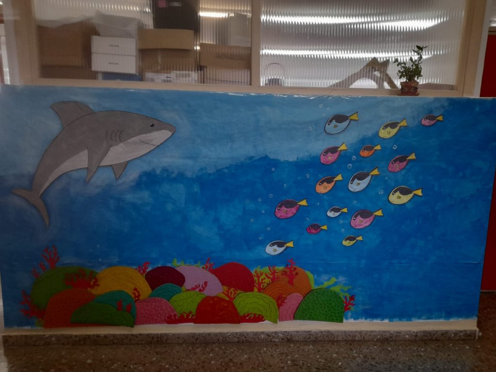 Hemos empezado con una realización de entorno acuático trabajando desde las áreas de Naturales y Sociales las especies marinas, animales en peligro de extinción, cómo apadrinar a especies concretas que viven en zonas frías, qué ocurre con los desechos que van al mar…