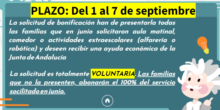El próximo 7 de septiembre finaliza el plazo de presentación de Bonificaciones para todas aquellas familias que en junio solicitaron aula matinal o comedor y deseen una ayuda económica