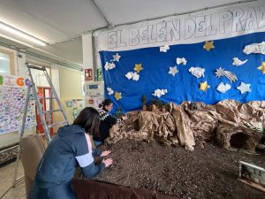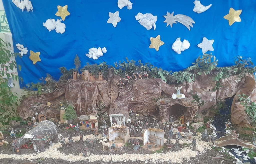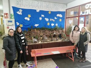 Este precioso Belén, realizado con primor y mucho gusto, con detalles navideños y con elementos muy propios del Prado: aquí se ve el Huerto, allá el caganer en un rincón, los senderos que conducen a Belén, nuestros olivos, la hoguera que da calor a los pastorcillos, el olor a tierra y serrín.. se debe a la maestría de nuestras mamis: Carmen, Araceli, Indira, Paqui y Araceli que lo han montado con gran ilusión y cariño.