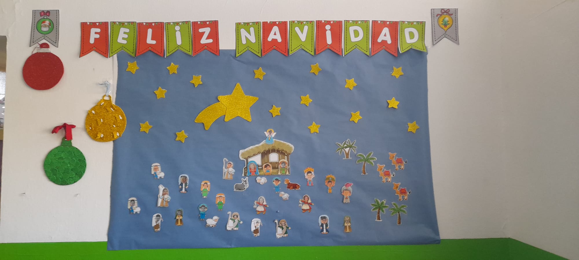 También brillan en nuestro cole ya los adornos de nuestro Salón de actos preparado para comenzar mañana la Muestra de Villancicos, realizado por madres del Centro, así como algunos belenes en clases y en las paredes de nuestro colegio.