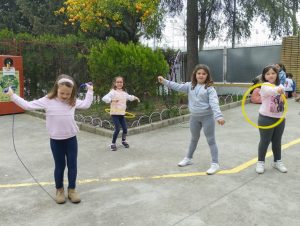Así pues, incorporamos juegos populares como la goma elástica, nuevas propuestas por parte de alumnado como el cubo de Rubik, práctica de cualidades físicas como la coordinación con los aros, etc… Todo ello en pro de proporcionar otras alternativas de ocio para nuestro alumnado, buscando como siempre mejorar la convivencia.