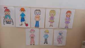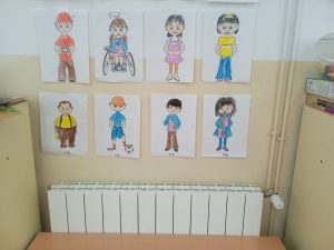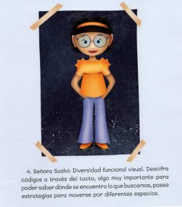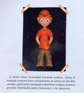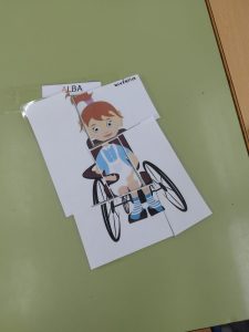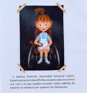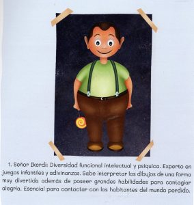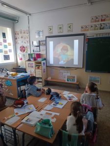 Presentación de los personajes, portada y se cuenta el cuento en la pizarra digital. En 5º, además, con una lluvia de ideas nos hemos preguntado ¿Cómo podemos mejorar la inclusión? Debate en el aula y en 6º se han analizado las barreras arquitectónicas, registrándolo en unas fichas por grupos.