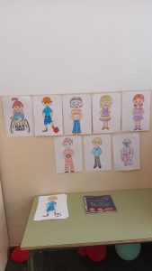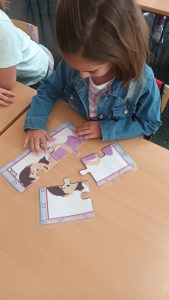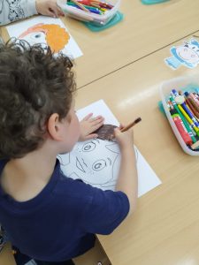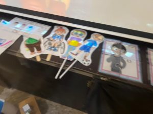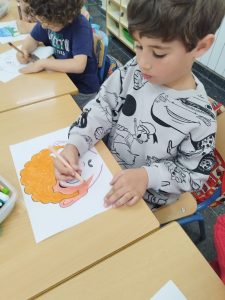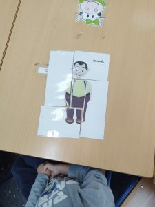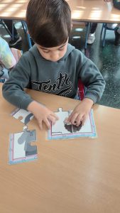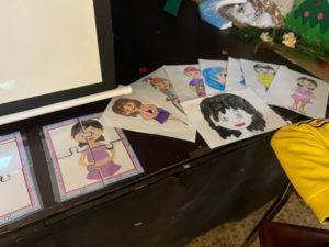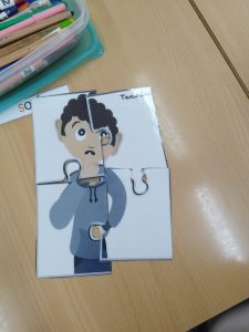 Colorean las caretas, los personajes, los colocan en soportes, se ubican en los espacios de clases, en palos, se plastifican y juegan con los puzzles.