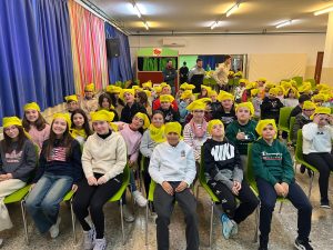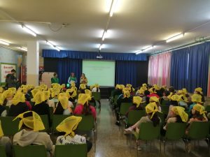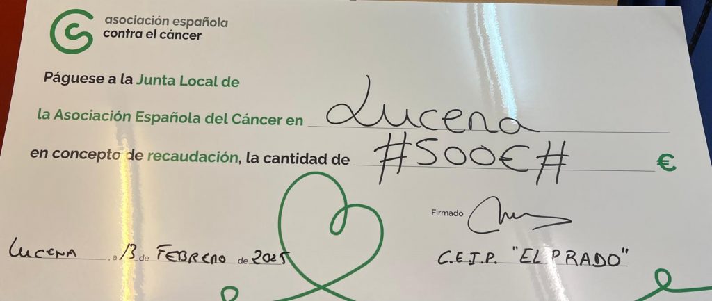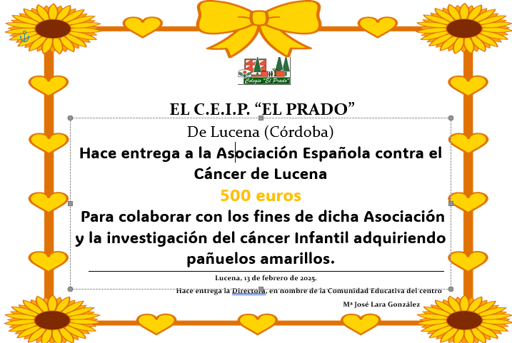 En el día de hoy, además, hemos querido hacerle entrega, en nombre de toda la Comunidad Educativa del C.E.I.P. «El Prado», de todo el dinero recaudado por las familias que, con su euro comprando un pañuelo amarillo, podrán ayudar a la investigación del cáncer infantil y que nos colocaremos mañana, día 14, en la actividad lectora de la Amistad y el Abrazo haciéndonos la foto de familia y convirtiendo al Prado en un solo corazón amarillo.
