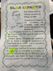 Centradas en torno a nuestra Situación de Aprendizaje del mes y nuestro Plan de Lectura planificada, donde se realizan unas productos finales como mini-libros, cuadernos de trabajos sobre Andalucía, trabajos en torno a Blas Infante y los símbolos, visitas al Parlamento de Andalucía, lecturas, hemos celebrado el acto institucional en torno a nuestros símbolos: bandera, escudo e himno y este año en homenaje a «Nuestras provincias», hemos desayunado con el rico aceite de oliva, hemos cantado, hemos disfrutado de talleres, cuentacuentos…