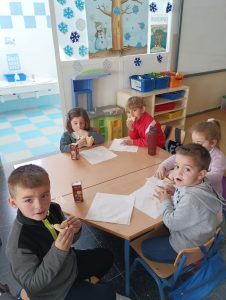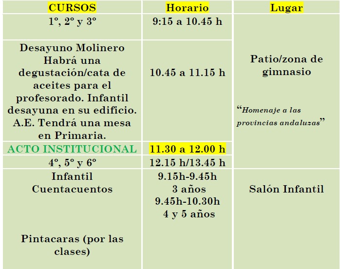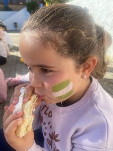 También tuvo importancia nuestra Gastronomía con el ya tradicional «Desayuno Molinero», con el pan ofrecido por el colegio, el aceite que la Junta de Andalucía nos regala, además de un rico tomate y jamón que la AMPA ha aportado para hacer el desayuno mucho más sabroso y que ha sido disfrutado por todo nuestro alumnado.