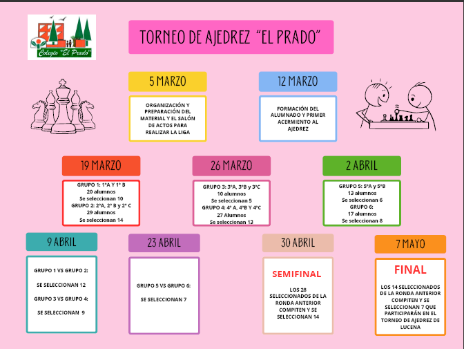 Y…por fin llegó el día! Como todos los años, empezamos a prepararnos para el gran torneo de Ajedrez que celebra Intercentros con todos los centros educativos de Lucena en mayo, buscando promover la convivencia entre el alumnado y profesorado y acercando al alumnado a este juego tradicional que implica concentración, agilidad mental y estrategia. El pasado jueves 13 de marzo tuvimos la primera sesión de formación, a cargo del especialista de Educación Física y la coordinadora de Intercentros, destinada a recordar las normas básicas del ajedrez, estrategias, organización de las próximas sesiones, etc. Una vez terminada la formación, comenzó la parte divertida…¡A jugar!