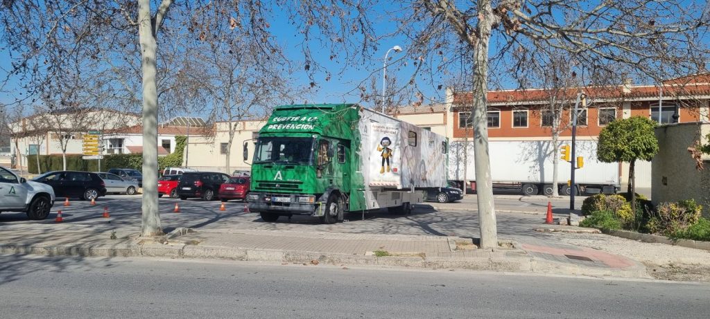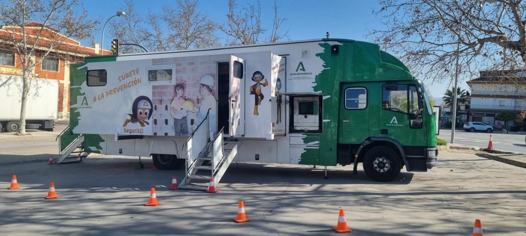 Esta Unidad Móvil de Formación (UMF) adscrita al Centro de Prevención de Riesgos Laborales de Jaén, que es el buque insignia del proyecto y sirve de ayuda a los equipos de técnicos y sanitarios de los Centros de Prevención de Riesgos Laborales para desarrollar actividades con el alumnado y sus tutores, con un método de trabajo participativo e innovador, tiene capacidad para 24 alumnos, y está dotada con equipamiento informático y audiovisual.