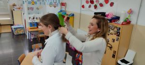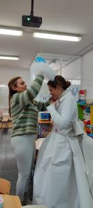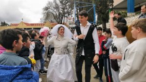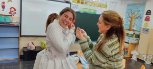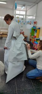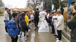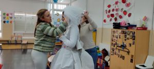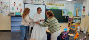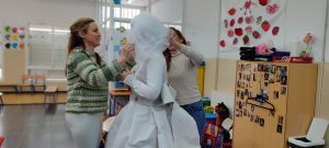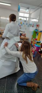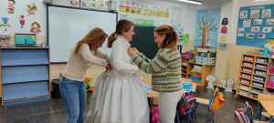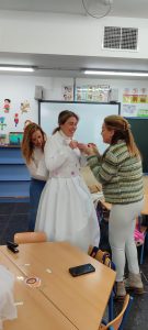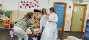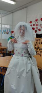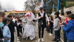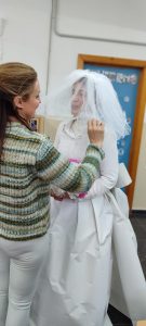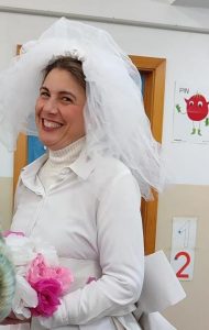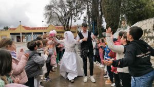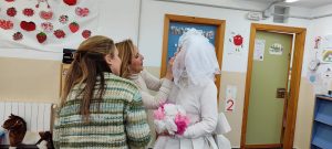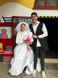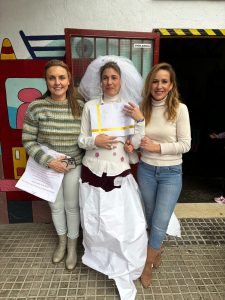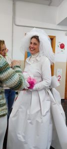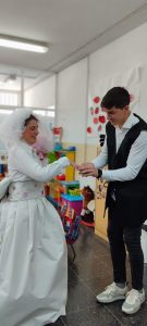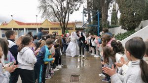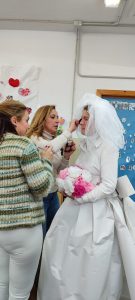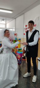 Y después de 8 años, llega una nueva Boda a nuestro Centro: tan especial como siempre, tocada con la originalidad de los vestidos hechos «en casa», con material de papel, tan feliz, con la colaboración de los propios compañeros que son padrinos, madres de la novia, peluqueras, maquilladoras… y que es disfrutada por todos: los alumnos vitorean a la novia y.. hasta se escucha la Marcha Nupcial y se baila con alegría como si se tratase de la misma ceremonia…