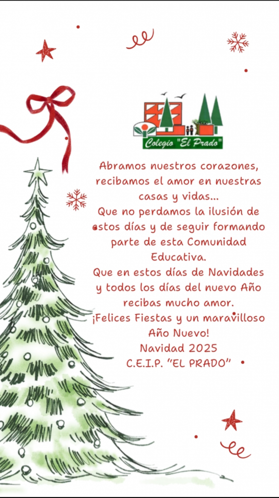 Desde la Coordinación TDE/WEB de este Centro y en nombre de toda la Comunidad Educativa, os deseo un Feliz Año 2026, unos felices Reyes y nos vemos a la vuelta de las vacaciones navideñas con renovadas fuerzas para el nuevo trimestre donde, seguro, nos esperan muchísimas actividades, programas, celebraciones, reconocimientos, novedades, etc. por vivir y disfrutar, compartiéndolo desde la web de nuestro colegio www.colegioelpradolucena.es y desde nuestras redes sociales: https://www.facebook.com/me/
