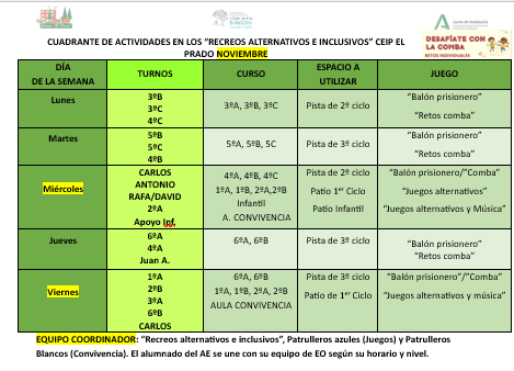 En este mes de noviembre y para el siguiente mes de diciembre, el alumnado tanto de infantil como de primaria continúan disfrutando de nuestros recreos alternativos. De esta forma, cada día de la semana, un curso será el protagonista del recreo, en el que podrán jugar a distintos juegos tanto populares, como el balón prisionero, la pelota sentada, retos con combas, etc., como de conocidos juegos de mesa como el ajedrez, el parchís, jenka, mikado, etc. Estos juegos irán cambiando cada mes de curso y los principales objetivos son conocer el mayor número de juegos posibles, fomentar el trabajo en equipo, la cooperación entre iguales…