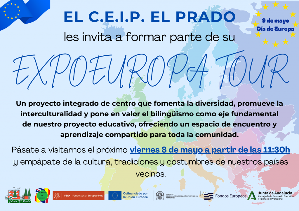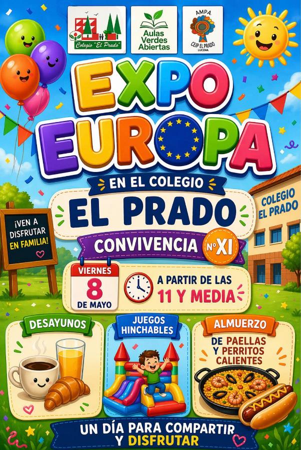 ¡YA SE APROXIMA NUESTRA XI CONVIVENCIA EN EL PRADO, organizada por nuestra AMPA y que este año, como novedad, se ha unido a nuestro Proyecto Integrado de Centro «EXPOEUROPA EL PRADO» que abrirá sus puertas a toda la Comunidad Educativa, a partir de las 11.30 horas el día 8 de mayo, viernes.